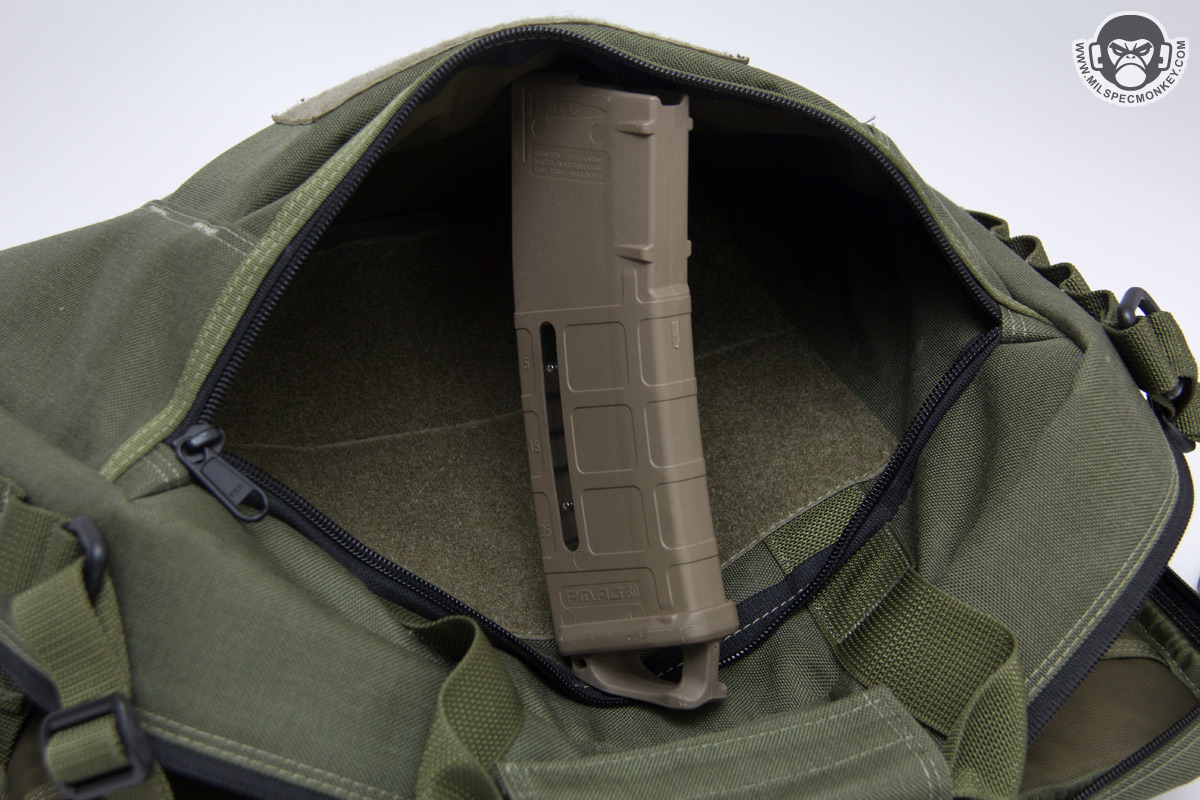 On over at the front side are 2 large double zippered pockets. The left compartment has a sleeve pocket with varied elastic divisions on top and even a key lanyard with SRB release. Compared to other lanyard setups the releasable SRB makes it a lot more convenient. To mix things up the right compartment has a sleeve pocket as well, but then has 2 divided sleeve pockets on top with elastic webbing closures. Not to be forgotten, both compartments have simple sleeve pockets on the internal front side as well. Worth noting these frontal pockets are tall enough to hold 30 round magazines even with Ranger Magpul plates. On the exterior of the pockets are good sized loop velcro fields for your cool guy patches or ID. I like that they are there for those who don't care about profile level as those who do care can take them off. An easy to overlook single zipper hides between the 2 frontal pockets which offer a nice extra stash zone to behind both pocket sides.