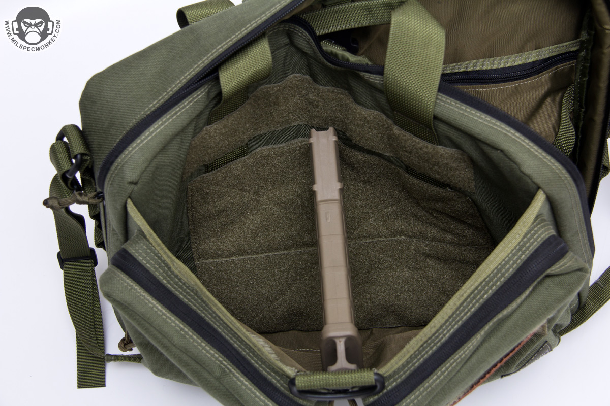 Like the description infers, the core bag concept is to be a shoulder bag that can carry an appropriate sized laptop. The Testudo adds a twist to this by having a set of stow-able backpack straps built into the back side. This makes the Testudo a hybrid pack where it can be in shoulder strap mode for quick access or switched over to backpack mode for much more comfort and mobility in longer hauls. It was nice to see the backpack straps were not half-assed either as they are fully padded and even include a sternum strap. When not in use, the backpack straps conveniently hide away in their back pocket keeping a clean look. The Spatha has its own features on the back side including a luggage strap for mounting on rolling bag handles and a single zippered pocket with a generous amount of loop velcro inside for more holding options.
