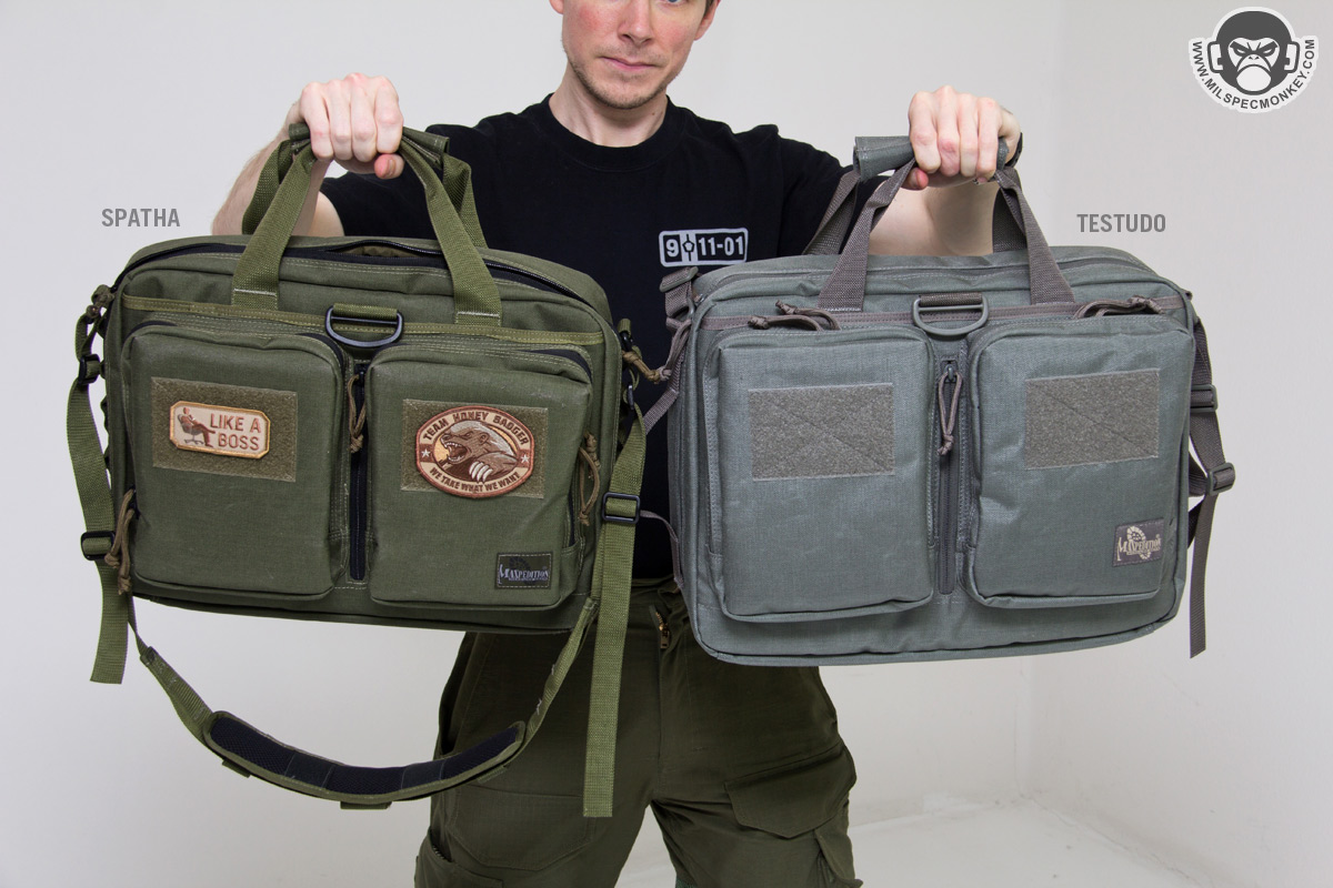 As a part of Maxpedition's new products this year they wanted to provide some visually lower profile designs with the Spatha and Testudo Laptop bag designs being good examples. The hard use functionality is all still there, with I'd say the main differences being less exterior pockets and a good color selection to offer more civilian looking options. The only feature that looks a bit specifically tactical is the external loop velcro which can easily be taken off for those who desire to. I'm showing the Spatha and Testudo together as they are very similar in core layout with the Testudo being slightly larger and having optional backpack functionality.