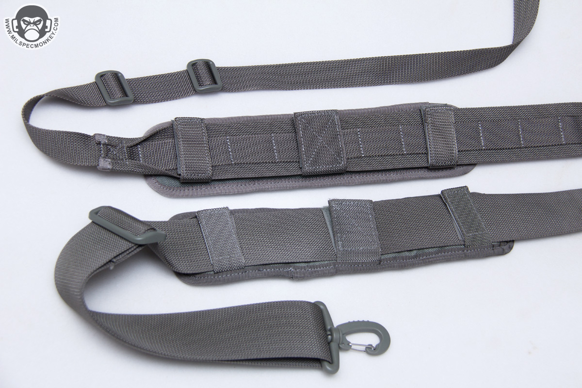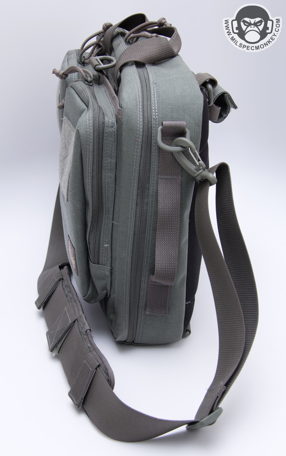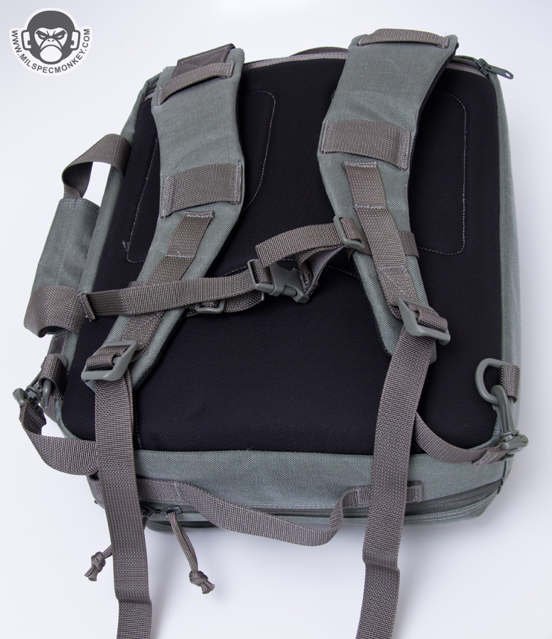 The sides vary a bit with the Spatha having civilian backpack style webbing loops. I'm not really sure what most people effectively use them for, but they do make good lash points when someone has to get creative. To mix things up the Testudo has less divisions to create the equivalent of extra pull handles. Both use 1" webbing for these sides to secure the shoulder strap D-rings. This leads into somewhat of a new shoulder strap design that secures using tri-glides and ramps up in size from 1" connection points to a 2" shoulder pad area. Some will miss the rotating snap hook hardware, but I will say the triglide option is more silent. Although this new strap makes decent sense on the Spatha it seems a bit mis-matched on the Testudo as undoing the shoulder strap with tri-glides is a slow process when wanting to properly convert to backpack mode without a dangling shoulder strap. Maxpedition offers alternate shoulder straps with snap hooks for purchase which offers more options, but the alternate shoulder strap should just be the one that comes with the Testudo to begin with.