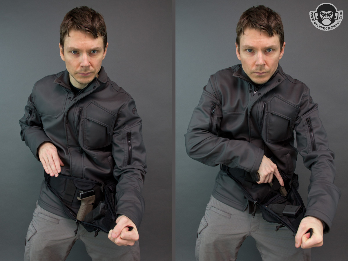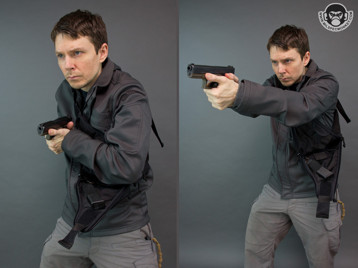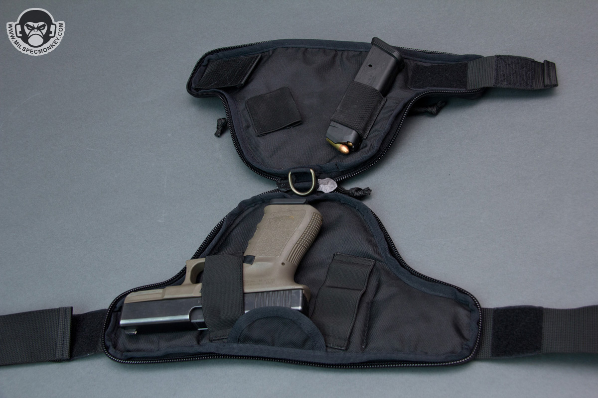 I'm not sure why I never considered it with waist bags before, but after seeing some example pictures, the Flash also works great worn across the shoulder. As an attempt to save idea face, I think the 2" wide main strap may be a factor where usually straps are pretty thin on these style bags. The shoulder mount works great If worried about slapping your nuts while running in waist worn mode and can lay under ones arm very shoulder holster like. When it comes to getting down to business and busting a pistol out, the Flash offers a nice wide opening however it takes a little getting used to since the angle will be a bit different than a traditional holster. The angle is pretty nice and open which is good, it is just different than where I'm used to going for. After a tear open on the main compartment it also makes something along the lines of a tactical shelf since the majority is open which makes the accessory zones accessible just in new zones when it comes to my personal muscle memory. Even if the compartment opens up all the way hanging down, usually the elastic has enough grip to hold onto your accessories, however this will put the items in a lower position accessibility wise. Time permitting one can slap the pull tab to the hook and loop to get a quick closure as a worthwhile gear management option.