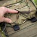 Up top is a smaller single zipper compartment. Lined with soft material it is solid place to stash eyewear or small electronics. Over in the back a good sized dual zipper opening compartment. the frontal interior has stiffener for support and there is a port hole to the main compatment on the upper back side to make it an obvious pocket option for hydration bladders. There is a hang strap, but it is a little odd being fairly long and uses a tiny bit of hook and loop closure at the end. The big show main compartment opens up with dual zippers and inside is a webbing fest. Both sides have 2" webbing with 1" webbing sewn on top, but the frontal interior side is setup for horizontal mounting and the back interior is setup for vertical mounting. The front seems close enough to PALS spec, however it is a bit odd the back side is off-spec where there is more vertical spacing. I asked P1G-TAC about it and it seemed this was due to fitting their intented SAW pouches better, but I tried to give them a fair warning most people are going to think it is pretty weird to be just a little off spec. One can still attach PALS pouches, just there will be more fudging involved and usually less weaving. I don't plan to use the 2" webbing slots anytime soon, but I could see where they may help in spacing options if lashing items directly to the webbing and perhaps make the panels a little more rigid at the same time. For a lesser seen feature there are 2 webbing straps on the upper frontal interior side to make for tear open pulls as seen on some CCW bags. Since there are 2 it allows for ambi options and the can attach to the outside using hook on the webbing and loop zones near the hydration ports.