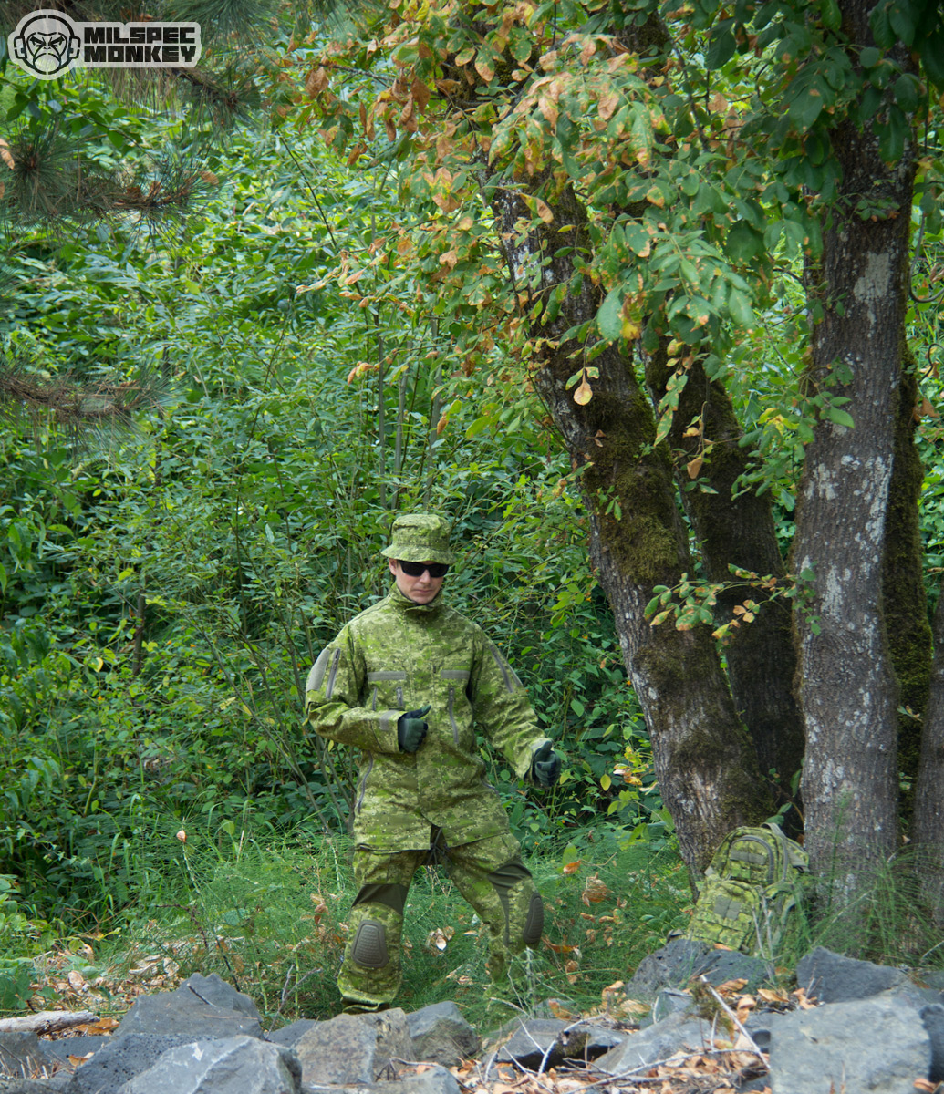 Starting with the exterior, there is a good dose of PALS webbing using fabric style so it matches the camo of the rest of the pack. One might be curious about the pattern shown which happens to be called JABA POLYOVA (Field Toad) and was developed by P1G-TAC. It has a pretty good range for brighter green areas including forest and tropical zones. I'll try not to ramble on too much about it since I'll show off more later, but it works pretty nice in my current healthy foresty Oregon area. Back to the PALS webbing there is a 4+ column x 4 row setup on the lower front. I say + since there are some extra slots, but they are off-spec short. Upper front has 4x2 and then 3x5 on the sides. There is even 3+ x 2 on the padded belt sides, they aren't fabric color matched like the other zones, but good ol' webbing will do. On that note, The color used for webbing, binding, hardware, and hook-and-loop is overall a bit grey in comparison so not exactly a perfect match with the overall green Field Toad Camo. Maybe their OD was too dark, but tan499 might have worked out a little better. I'm aware how getting custom colors for every detail is no fun so I'll guess P1G-TAC considered their options. It isn't PALS spec, but there is some bonus webbing on the main shoulder strap for routing or adding small pouches. There is even some webbing down the back middle, the intent is a bit unclear with my best guess at offering options to mount the pack directly to a vest.