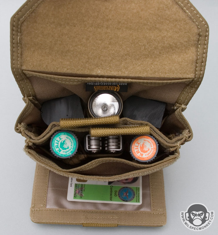Another feature setting the Monkey Combat Pouch apart from the rest is the unique ID flap. Although at first glance, one may want to pull up on the pull tab, the tab is pulled down to open. A clear vinyl sleeve with anti-glare texture allows placement for 2 IDs, a mini map, ballistic sheet, HVT pictures, or whatever slim item one wants to put in there. The folding of the pocket naturally makes 2 divisions, but there is only one opening to deal with. When the flap is closed, the goods are velcro sealed securely inside. This allows the user to quickly flash their ID or view intel when needed, then go back to business being fully concealed. The way the ID flap is stitched to the pouch creates a cave area where items can be stored. A flashlight, beatstick, or knife fit in here well for quick access, but low security. Alternatively slim paper documents can be hidden inside as well.