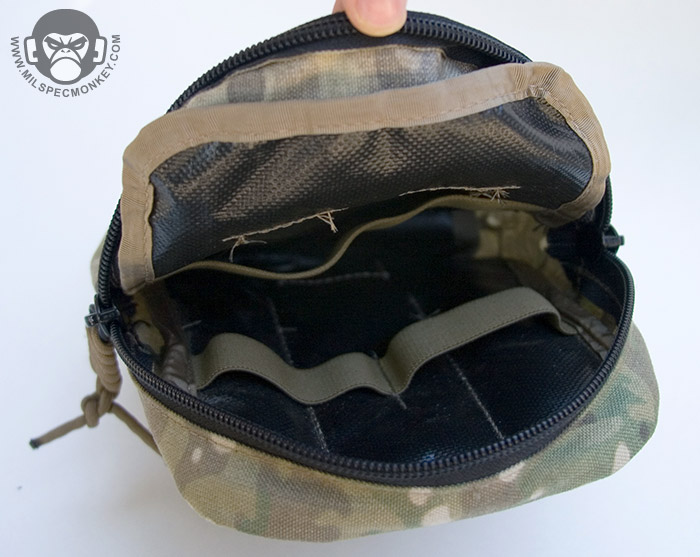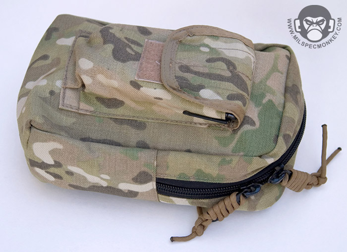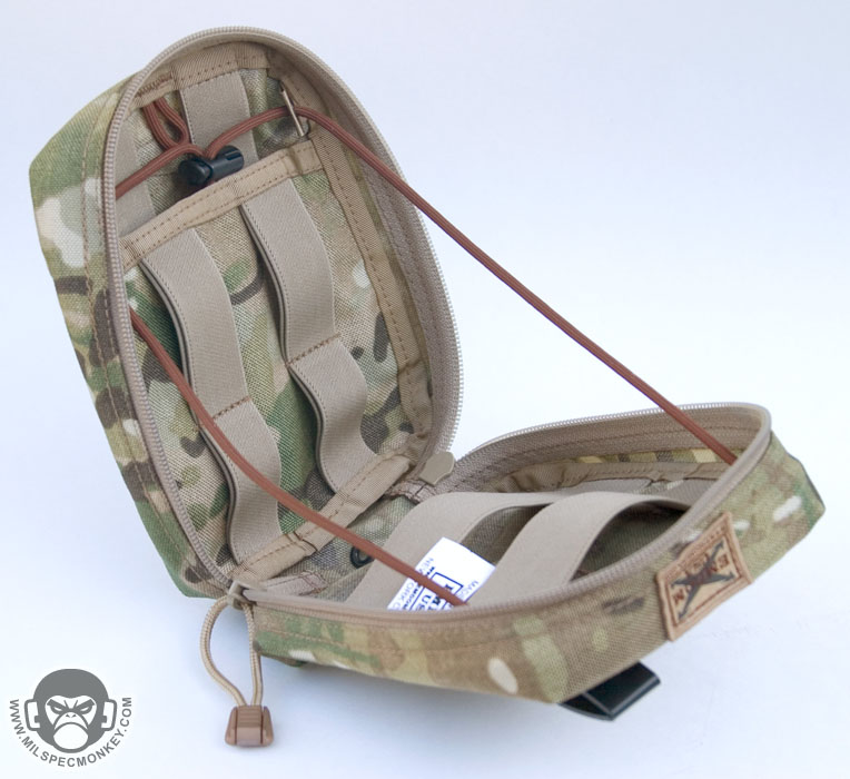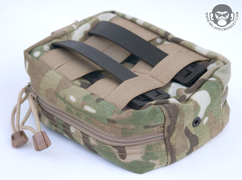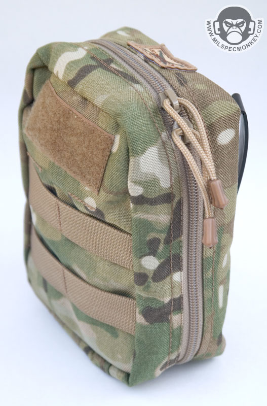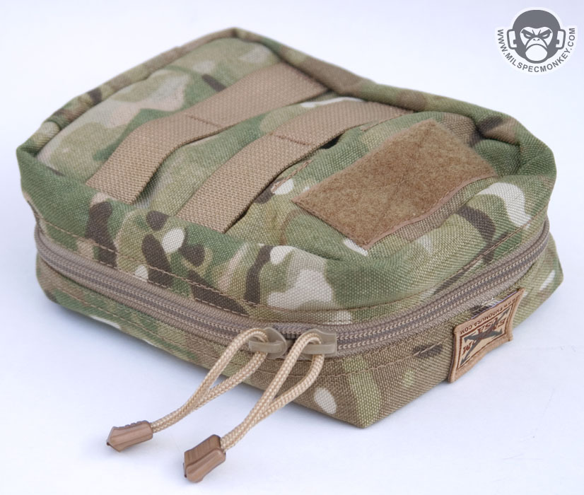 Originally intended for medical supplies, but can also work well as a general purpose pouch with built in elastic and pockets. The pouch can be zippered down for a full 180 degree opening, but a 550 cord and cordlock system is standard to adjust and limit the opening. Has bonus PALS and loop velcro on the front, a very full featured pouch especially for the price, $32.95. Comes with long Malice Clips.
