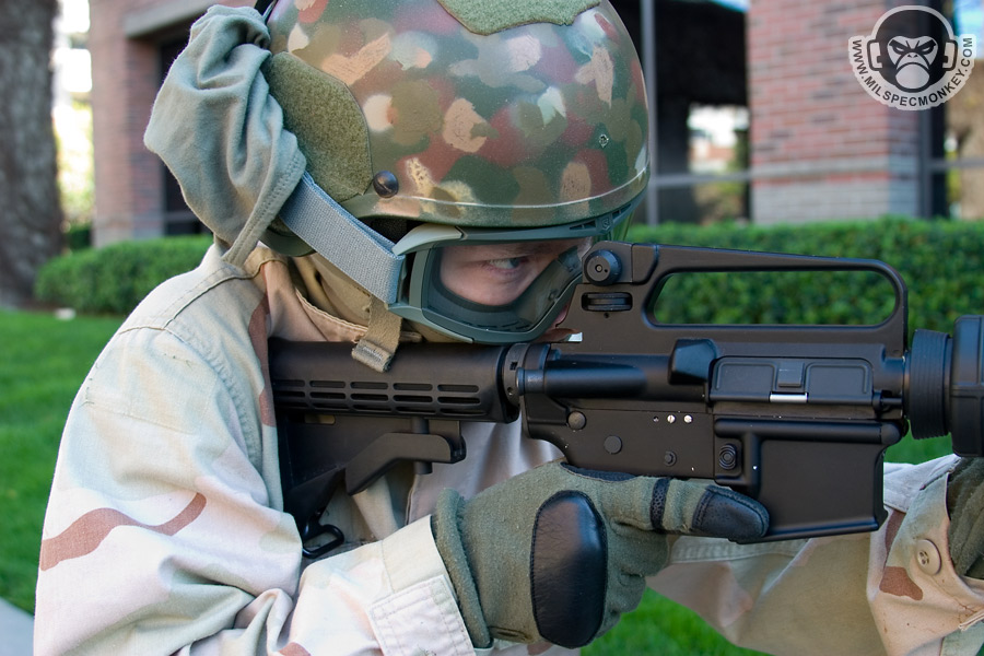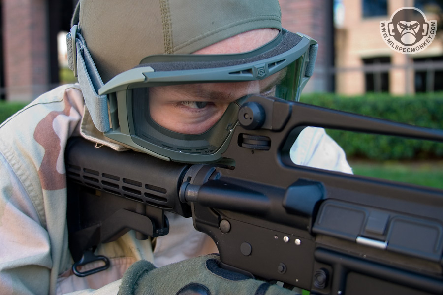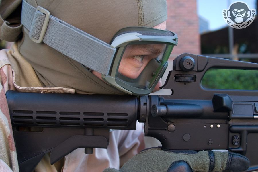 Just pull up on the frame and the rest is easy. I worry it may be too easy and perhaps the frame can start to become un-attached on accident, but I have had no issues yet. Just in case you didn't know, most lens changing on goggles is balls hard. The strap detatch is also fairly easy and can be done by twisting the end piece away from the frame. Re-attaching is a little harder, but nothing dramatic. The seal against the face is just a rubber-like material, but still comfortable. The nose area does not push in on my nostrils at all like the Flakjaks do a little due to its padding. The Desert Locusts fit great with a MICH and just barely touch the rifle when aiming with a fully collapsed M4. I can get a nice sight picture without feeling the goggles fighting against the rifle to get my face where it needs to be. Although these are not made to wear with glasses, prescription inserts are available. I hope to update with a vicious fog test soon. The DLs have anti fog coating and foam covered vents, but thermal lenses are not available yet. Check out the revision site for all the detailed technical specs: