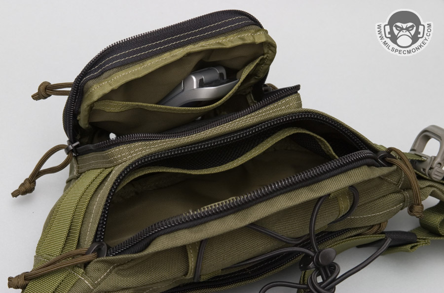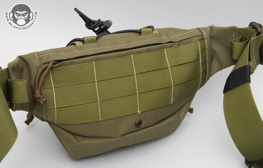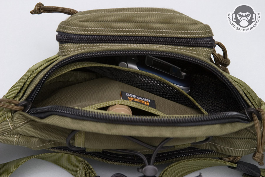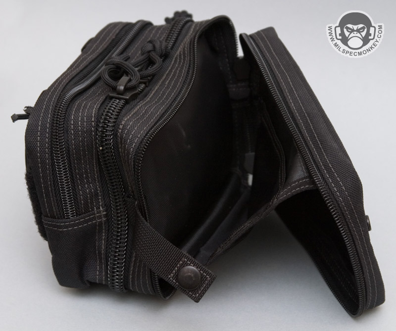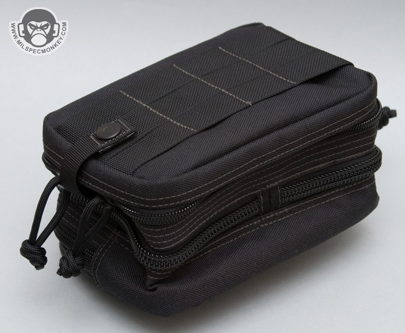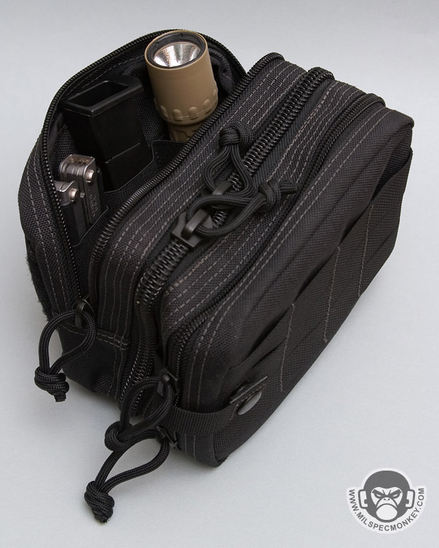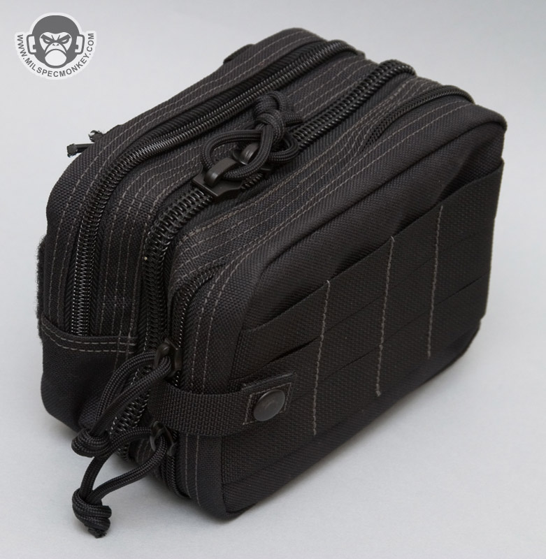 The Packrat makes for a nice take on an admin pouch sized multipurpose pouch. Elastic on the inner front is good for pens and tools, while the back inner elastic is setup more for small notebooks. In the back is a sleeve pocket for extra documents or thin division. Personally I'd like to see another elastic strip on the inner back for more holding options. Since this pouch opens up clamshell style, it makes the pouch much more versatile than most admin pouches out there. Although PALS webbing on the front is good for quick places to put things, I'd drop the top strip and add loop velcro.
